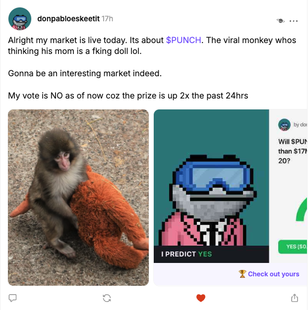 Creators work closely with us in turning their opinions into markets. Today, this process is manual. Very soon, we will be launch an agent that creators can tag in their cast and turn their take into a prediction market.