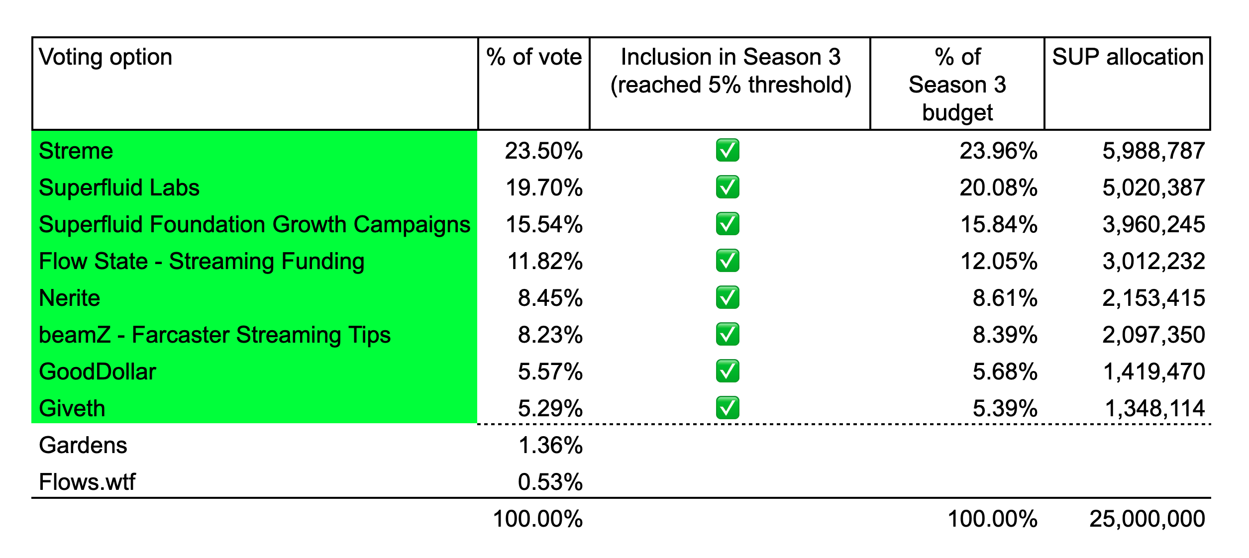5% cut-off - Eligible Campaigns with less than 5% of the vote will not be included in Season 3 and SUP votes for them will be redistributed to the successful campaigns on a pro-rata basis.
